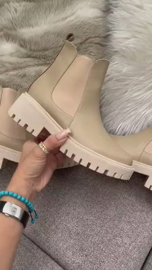 Fabricados en cuero nappa beige de alta calidad, estos botines tienen un diseño minimalista y sofisticado que se adapta a cualquier look.